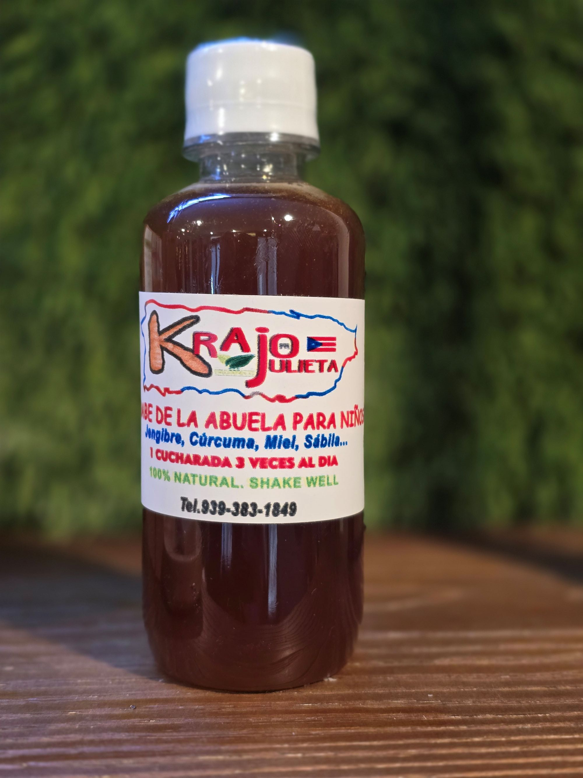 Jarabe 100% natural, contiene menos cantidad de jengibre para los niños, cúrcuma,sabila, limón, miel y ajo por si hay infección……. Se utiliza para reforzar el sistema inmune, calmar la tos, resfriado, dolor de garganta, expectorante, inflamación, dolor muscular, sinusitis, asma, bronquitis, pulmonía, micoplasma y más..